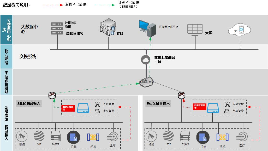 旁路接入:网关采用旁路接入社区局域网,不影响原有车闸、门禁、监控系统的正常工作,只采集视频、人脸、结构化数据上传到汇聚平台